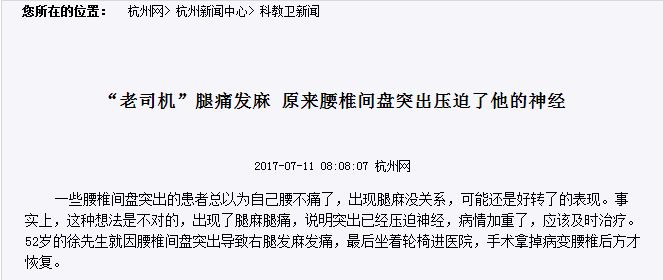 2017年7月11日,杭州網發布消息《“老司機”腿痛發麻 原來腰椎間盤突出壓迫了他的神經》稱52歲的徐先生就因腰椎間盤突出導致右腿發麻發痛,最后坐著輪椅進醫院,手術拿掉病變腰椎后方才恢復。