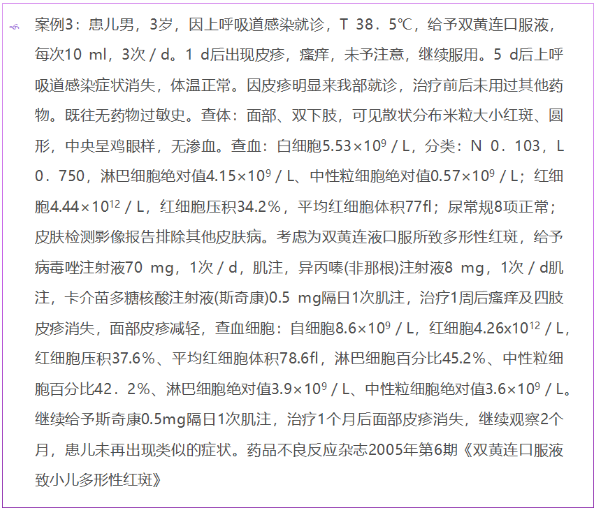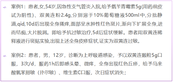雙黃連制劑有許多劑型包括,注射制劑(包括注射液、凍干粉)和口服制劑(包括顆粒劑、糖漿劑、片劑、泡騰片、分散片、咀嚼片、含片、合劑、滴丸、硬膠囊、軟膠囊、滴劑),以及外用制劑(包括滴眼劑、栓劑等)。據國家藥品不良反應中心統計,在所有雙黃連制劑中,雙黃連注射劑的不良反應發生率最高占72.64;在所有的不良反應表現里,過敏反應發生的概率最高為76.8%,其中皮膚性過敏反應最易發生。此外還有消化系統、神經系統及循環系統不良反應。下面就來看下這些過敏反應及具體案例。