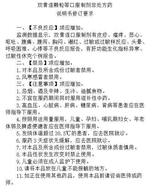 以上不良反應為筆者能夠找到相應案例的不良反應,還有部分不良反應表現資料較少,這里有一份國家藥監局要求修訂的說明書,是今年3月國家藥監局發布的對雙黃連口服制劑說明書修訂的通知所含內容。