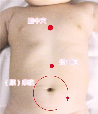摩腹:小兒腹部,肚臍周圍為腹。用手掌或并攏四指在該處做順時針環形摩動稱“摩腹”。
