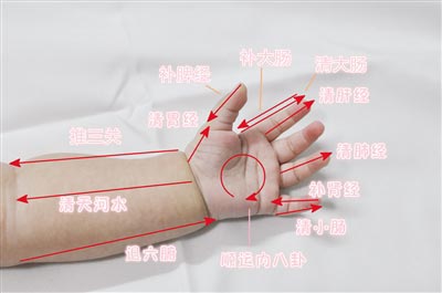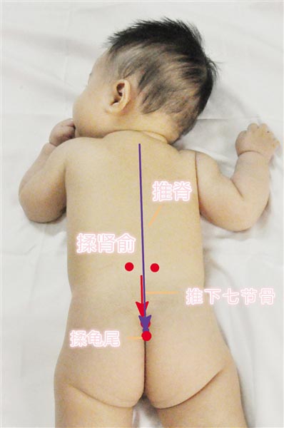推拿處方:揉外勞宮300次,推三關100~200次,清補大腸300次,清小腸200次,清補脾經300次,揉龜尾300次。