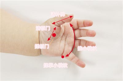 擦膻中:前正中線上,兩乳頭連線的中點為膻中。用手掌大魚際(大拇指一側)上下擦該處稱“擦膻中”。