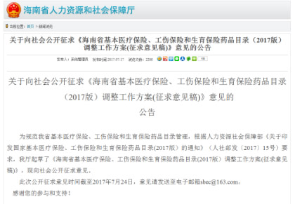 人民網(wǎng)北京7月18日電 (劉倩)17日,海南省人社廳發(fā)布《基本醫(yī)療保險(xiǎn)、工傷保險(xiǎn)和生育保險(xiǎn)藥品目錄(2017年版)調(diào)整工作方案(征求意見稿)》,至此,發(fā)布省級(jí)醫(yī)保增補(bǔ)方案省份增至6個(gè)省。其他5省份分別是:青海、寧夏、山西、四川和貴州。