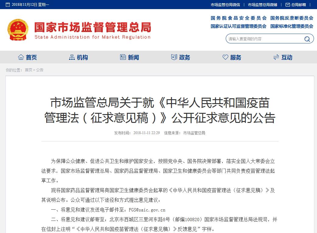 人民網北京11月12日電 記者從國家市場監督管理總局官網獲悉,11日,國家市場監管總局關于就《中華人民共和國疫苗管理法(征求意見稿)》公開征求意見。公眾可通過兩種途徑和方式提出意見建議,意見反饋截止時間為2018年11月25日。