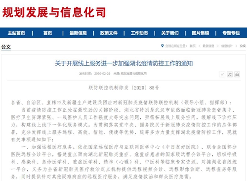 人民網(wǎng)北京2月27日電 國(guó)家衛(wèi)生健康委員會(huì)疾病預(yù)防控制局26日于官網(wǎng)發(fā)布《關(guān)于開展線上服務(wù)進(jìn)一步加強(qiáng)湖北疫情防控工作的通知》(以下簡(jiǎn)稱“通知”)稱,當(dāng)前疫情防控工作正處在關(guān)鍵階段,湖北省特別是武漢市依然面臨新冠肺炎患者集中、醫(yī)療衛(wèi)生資源緊張、一線醫(yī)護(hù)人員工作強(qiáng)度大等突出問(wèn)題,亟需拓展線上服務(wù)空間。對(duì)此,通過(guò)加強(qiáng)遠(yuǎn)程醫(yī)療服務(wù)、推進(jìn)人工智能服務(wù)、提升中醫(yī)診療服務(wù)、開展心理援助服務(wù)、規(guī)范網(wǎng)上診療服務(wù)、拓展對(duì)口支援服務(wù)、強(qiáng)化技術(shù)保障服務(wù)等7方面內(nèi)容,拓展線上服務(wù)空間,緩解線下診療壓力,構(gòu)建線上線下一體化服務(wù)模式。